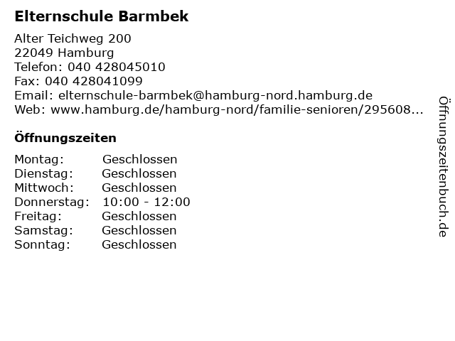 | Öffnungszeiten Elternschule Barmbek in Hamburg anzeigen | |