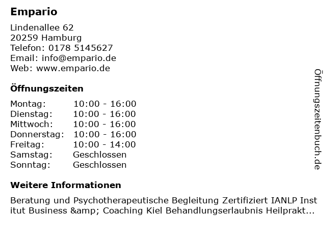 | Öffnungszeiten Empario in Hamburg anzeigen | |