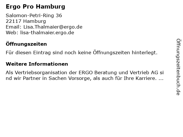 | Öffnungszeiten Ergo Pro Hamburg in Hamburg anzeigen | |