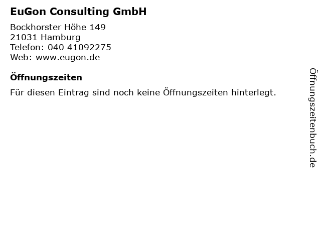 | Öffnungszeiten EuGon Consulting GmbH in Hamburg anzeigen | |
