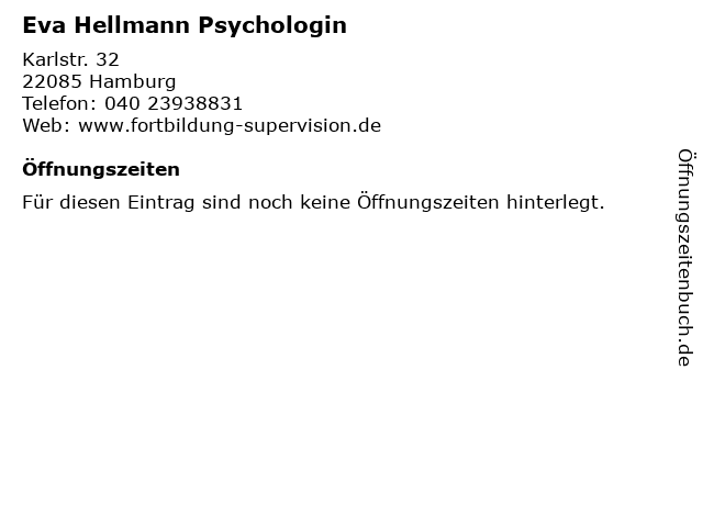 | Öffnungszeiten Eva Hellmann Psychologin in Hamburg anzeigen | |