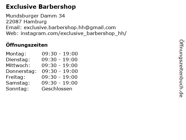 | Öffnungszeiten Exclusive Barbershop in Hamburg anzeigen | |