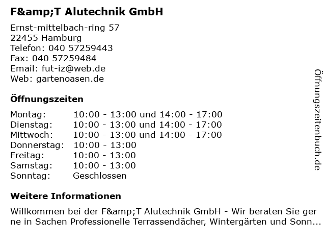 | Öffnungszeiten F&T Alutechnik GmbH in Hamburg anzeigen | |