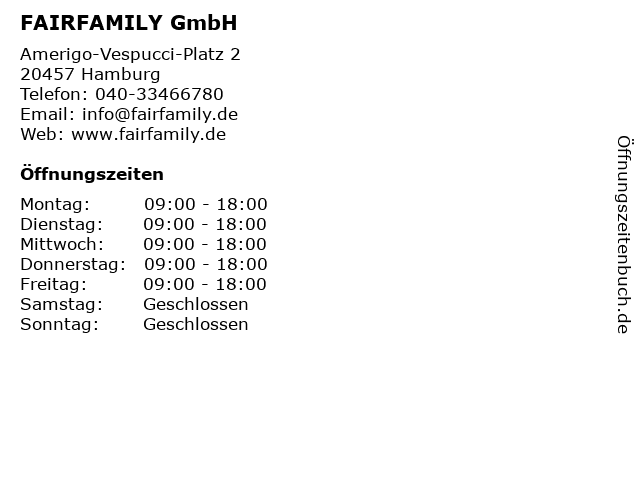 | Öffnungszeiten FAIRFAMILY GmbH in Hamburg anzeigen | |