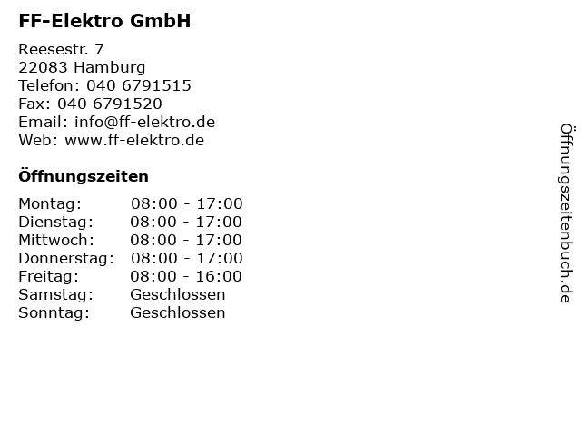 | Öffnungszeiten FF-Elektro GmbH in Hamburg anzeigen | |