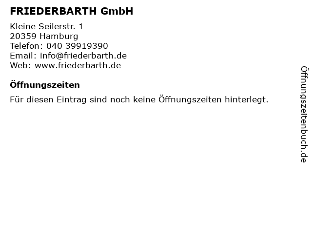 | Öffnungszeiten FRIEDERBARTH GmbH in Hamburg anzeigen | |