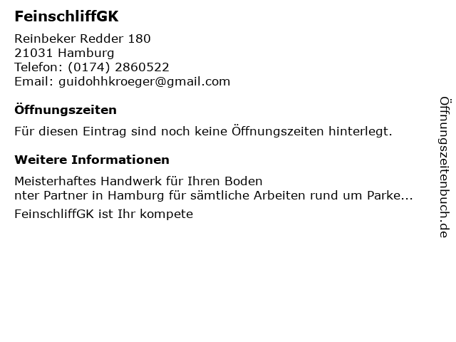| Öffnungszeiten FeinschliffGK in Hamburg anzeigen | |
