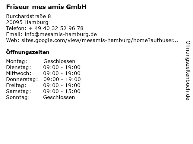 | Öffnungszeiten Friseur mes amis GmbH in Hamburg anzeigen | |
