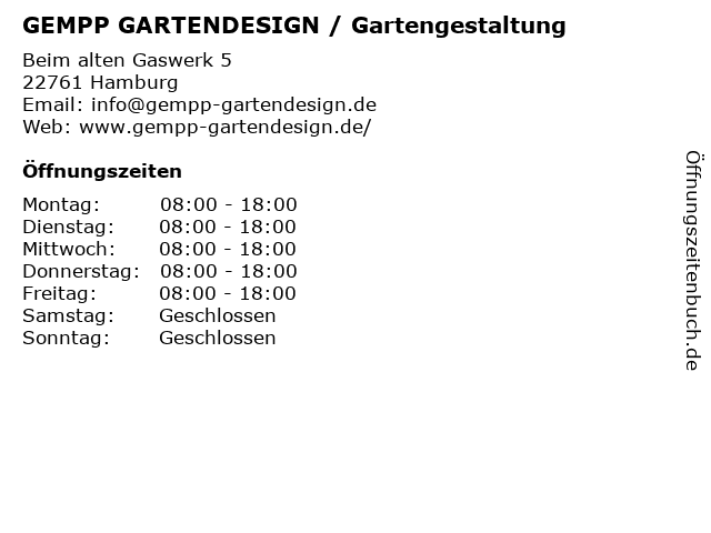 | Öffnungszeiten GEMPP GARTENDESIGN / Gartengestaltung in Hamburg anzeigen | |