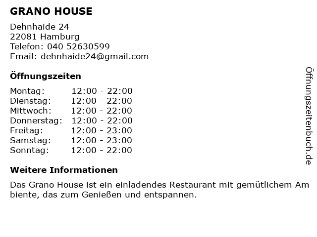 | Öffnungszeiten GRANO HOUSE in Hamburg anzeigen | |