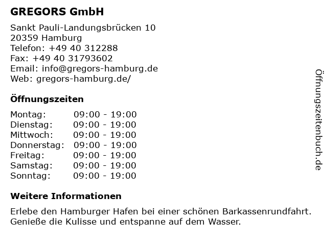 | Öffnungszeiten GREGORS GmbH in Hamburg anzeigen | |