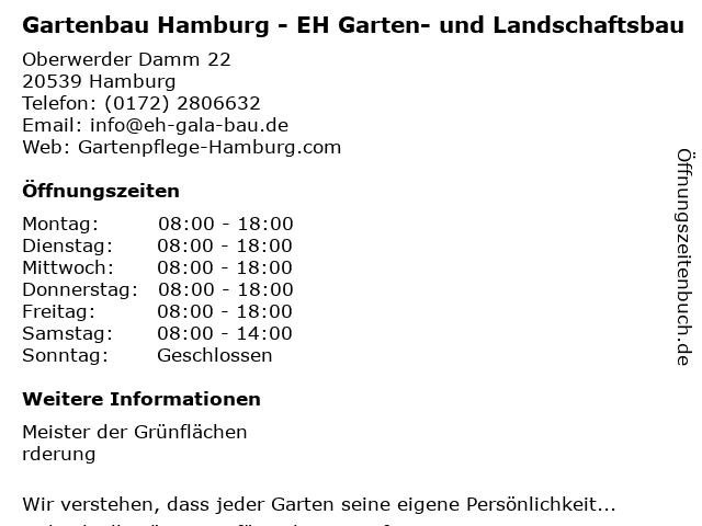 2 BeMu Garten- und Landschaftsbau - Winterdienst GmbH (Entfernung: 3,11 km) Witternstr. 3, 21107 Hamburg 5 Herbert Radies Garten- u. Landschaftsbau Ingenieurbüro (Entfernung: 5,21 km) Meiendorfer Mühlenweg 14 B, 22393 Hamburg 6 Gino Orfano Garten- und Landschaftsbau, G. Schau (Entfernung: 6,18 km) Rönneburger Kirchweg 61, 21079 Hamburg |