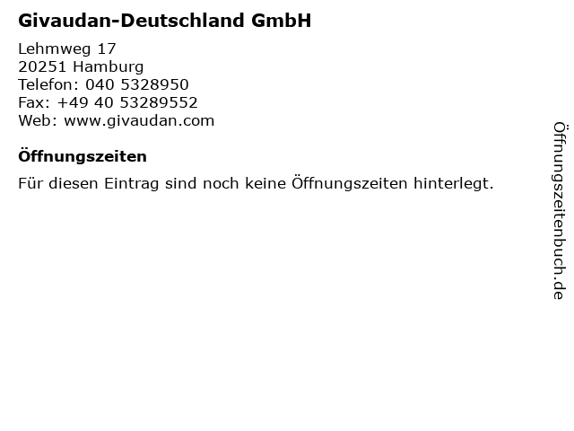 | Öffnungszeiten Givaudan-Deutschland GmbH in Hamburg anzeigen | |
