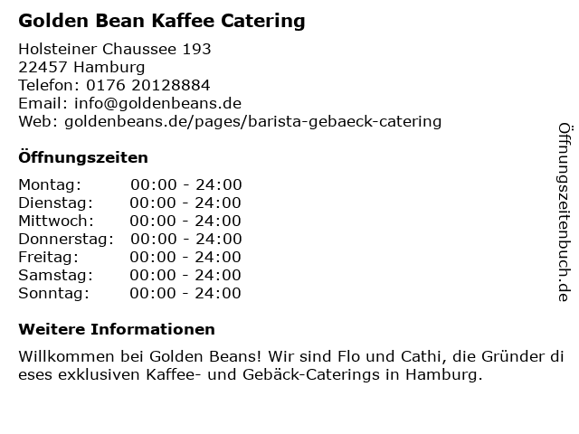 | Öffnungszeiten Golden Bean Kaffee Catering in Hamburg anzeigen | |
