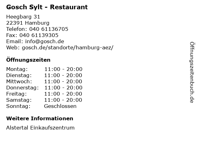 | Öffnungszeiten Gosch Sylt - Restaurant in Hamburg anzeigen | |
