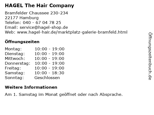 | Öffnungszeiten HAGEL The Hair Company in Hamburg anzeigen | |