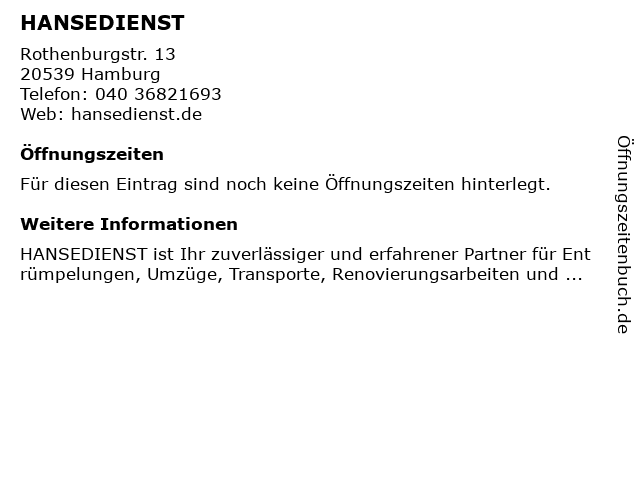 | Öffnungszeiten HANSEDIENST in Hamburg anzeigen | |