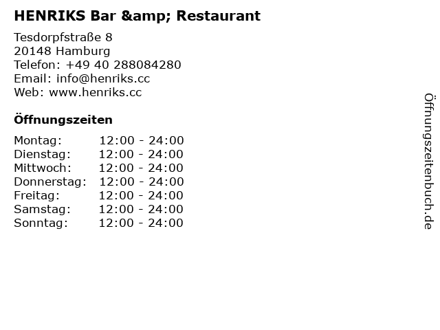 | Öffnungszeiten HENRIKS Bar & Restaurant in Hamburg anzeigen | |