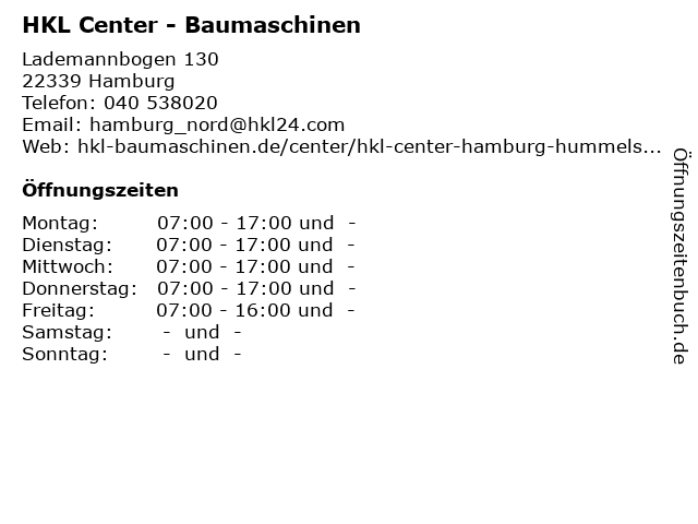 | Öffnungszeiten HKL Center - Baumaschinen in Hamburg anzeigen | |