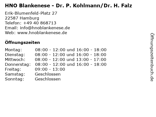 Branchen & Suchbegriffe zu HNO Blankenese - Dr. P. Kohlmann/Dr. H. Falz:blankenese, dr., falz, h., hno, kohlmann/dr., p. |