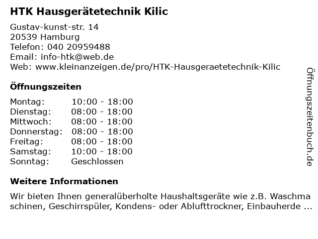 | Öffnungszeiten HTK Hausgerätetechnik Kilic in Hamburg anzeigen | |