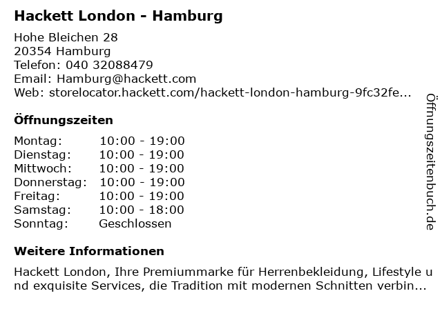 | Öffnungszeiten Hackett London - Hamburg in Hamburg anzeigen | |