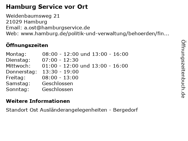 | Öffnungszeiten Hamburg Service vor Ort in Hamburg anzeigen | |
