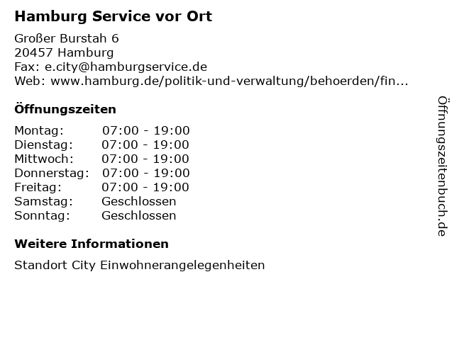 | Öffnungszeiten Hamburg Service vor Ort in Hamburg anzeigen | |