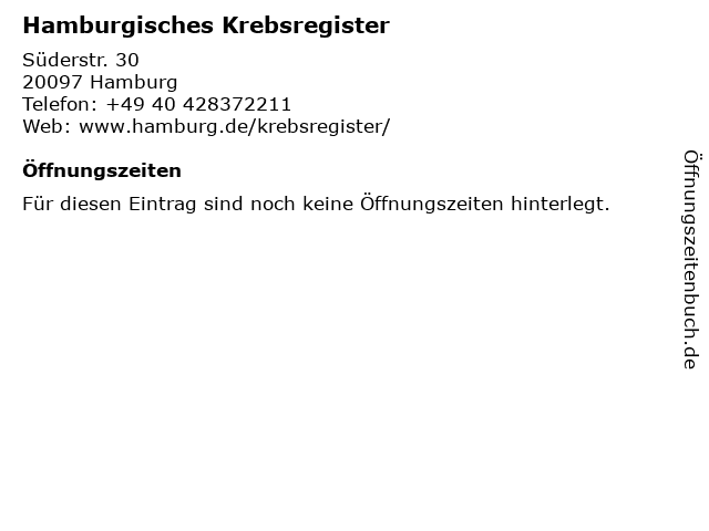 | Öffnungszeiten Hamburgisches Krebsregister in Hamburg anzeigen | |