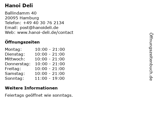 | Öffnungszeiten Hanoi Deli in Hamburg anzeigen | |