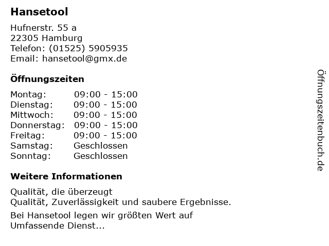 | Öffnungszeiten Hansetool in Hamburg anzeigen | |