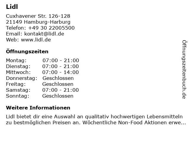 | Öffnungszeiten Lidl in Hamburg-Harburg anzeigen | |
