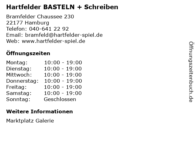1 Hartfelder Marken- und Qualitätsspielzeug (Entfernung: 0,00 km) Bramfelder Chaussee 230, 22177 Hamburg 6 |