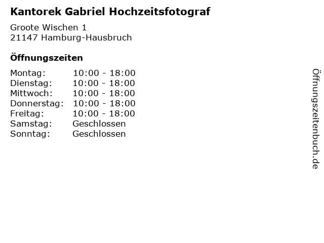 | Öffnungszeiten Kantorek Gabriel Hochzeitsfotograf in Hamburg-Hausbruch anzeigen | |