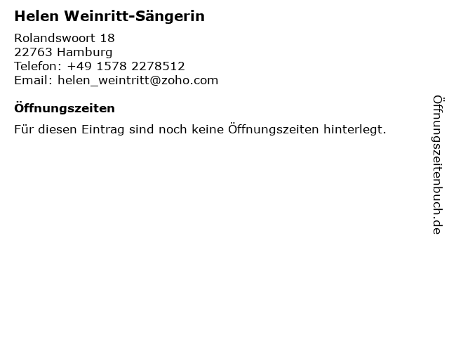| Öffnungszeiten Helen Weinritt-Sängerin in Hamburg anzeigen | |