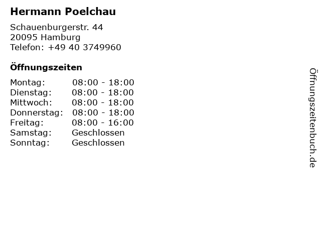 | Öffnungszeiten Hermann Poelchau in Hamburg anzeigen | |