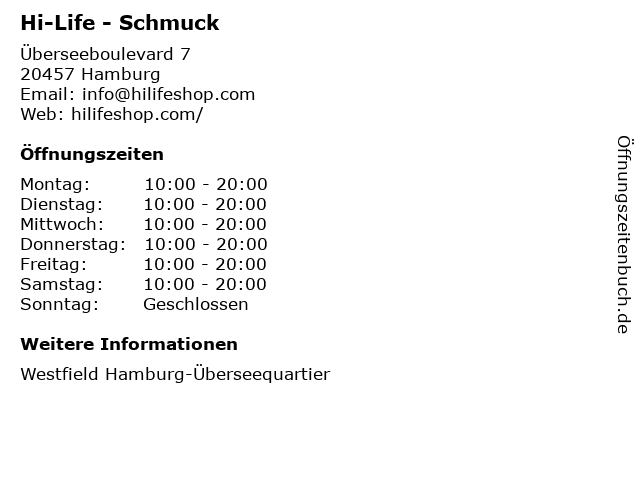 | Öffnungszeiten Hi-Life - Schmuck in Hamburg anzeigen | |
