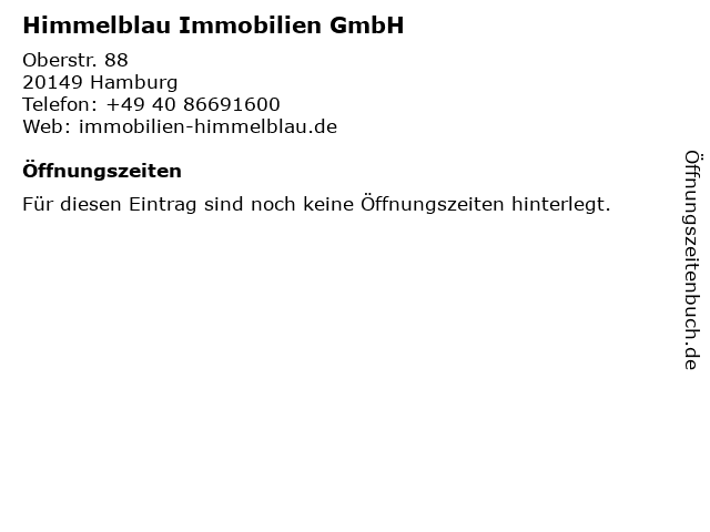 | Öffnungszeiten Himmelblau Immobilien GmbH in Hamburg anzeigen | |