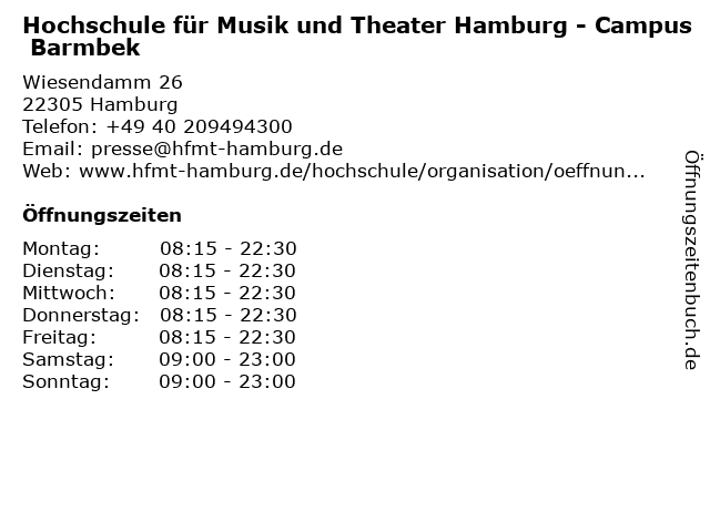 Branchen & Suchbegriffe zu Hochschule für Musik und Theater Hamburg - Campus Barmbek:austauschstudierende, barmbek, campus, hochschule, hochschulen, musik, services, studierenden, theater, universitäten |