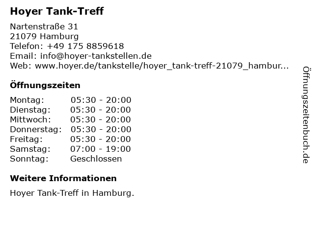 | Öffnungszeiten Hoyer Tank-Treff in Hamburg anzeigen | |
