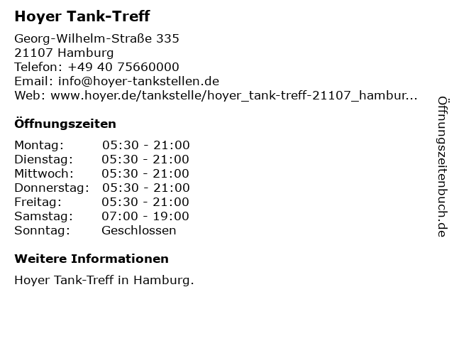 | Öffnungszeiten Hoyer Tank-Treff in Hamburg anzeigen | |
