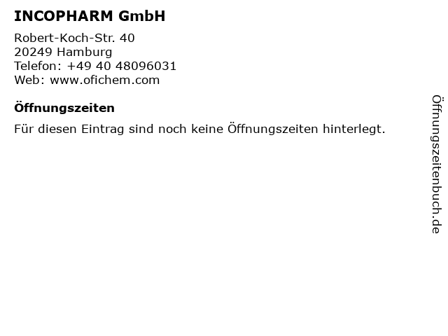 | Öffnungszeiten INCOPHARM GmbH in Hamburg anzeigen | |
