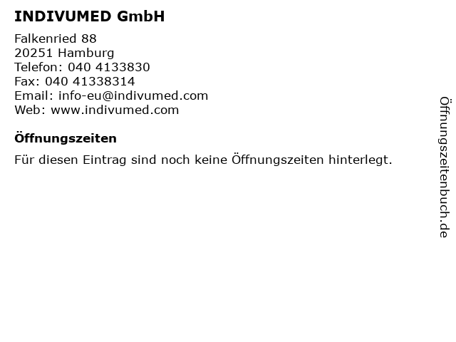 | Öffnungszeiten INDIVUMED GmbH in Hamburg anzeigen | |