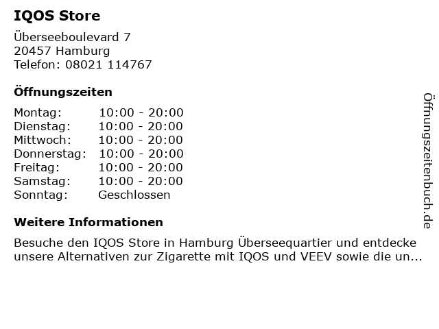 | Öffnungszeiten IQOS Store in Hamburg anzeigen | |