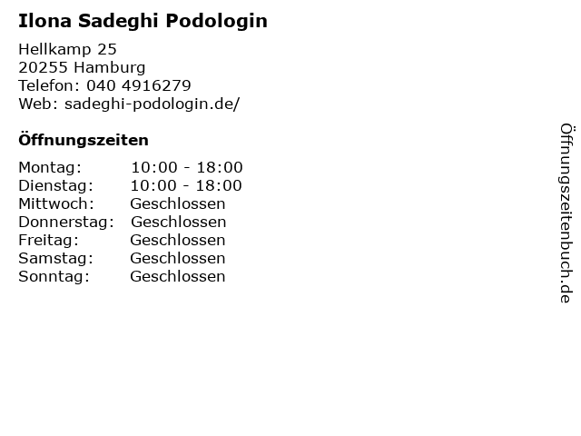 | Öffnungszeiten Ilona Sadeghi Podologin in Hamburg anzeigen | |