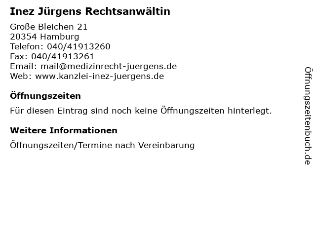 | Öffnungszeiten Inez Jürgens Rechtsanwältin in Hamburg anzeigen | |