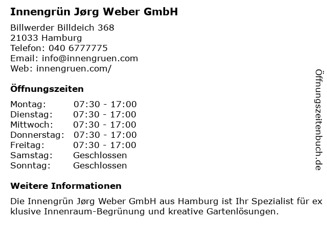 | Öffnungszeiten Innengrün Jørg Weber GmbH in Hamburg anzeigen | |