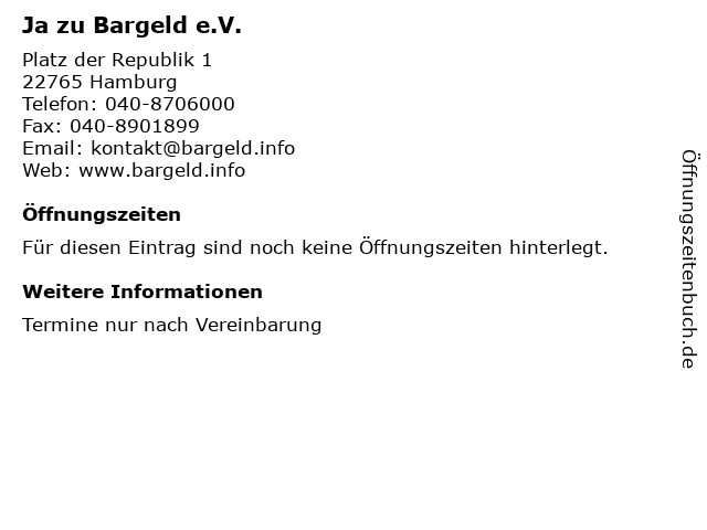 | Öffnungszeiten Ja zu Bargeld e.V. in Hamburg anzeigen | |
