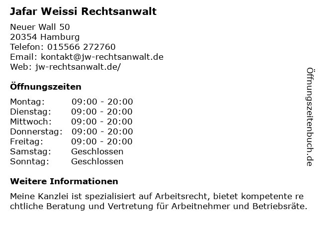 | Öffnungszeiten Jafar Weissi Rechtsanwalt in Hamburg anzeigen | |