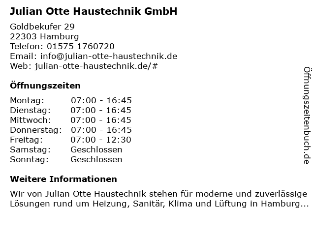 | Öffnungszeiten Julian Otte Haustechnik GmbH in Hamburg anzeigen | |